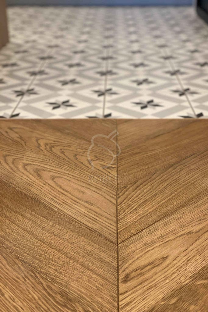 Drewniane podłogi w naszej ofercie docinamy odpowiednio do kształtu płytek. Możliwości jest tyle, co koncepcji i formatów płytek, np. klejonych pod kątem lub modnych w ostatnich latach o kształcie heksagonalnym.