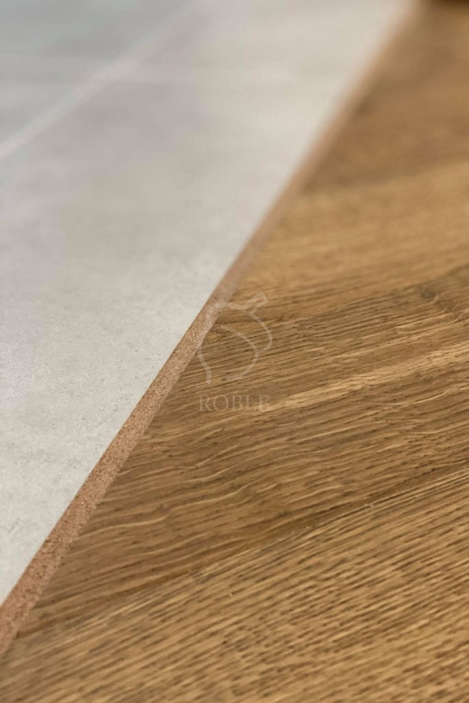 Korek – wybierany najczęściej przez naszych Klientów, posiada dobre właściwości termoizolacyjne, dlatego z powodzeniem można stosować go przy łączeniu desek warstwowych i płytek/kamienia w systemie ogrzewania podłogowego. Korek jest barwiony pod kolor płytek/kamienia lub drewnianych desek, dzięki czemu pozostaje niemal niezauważalny.